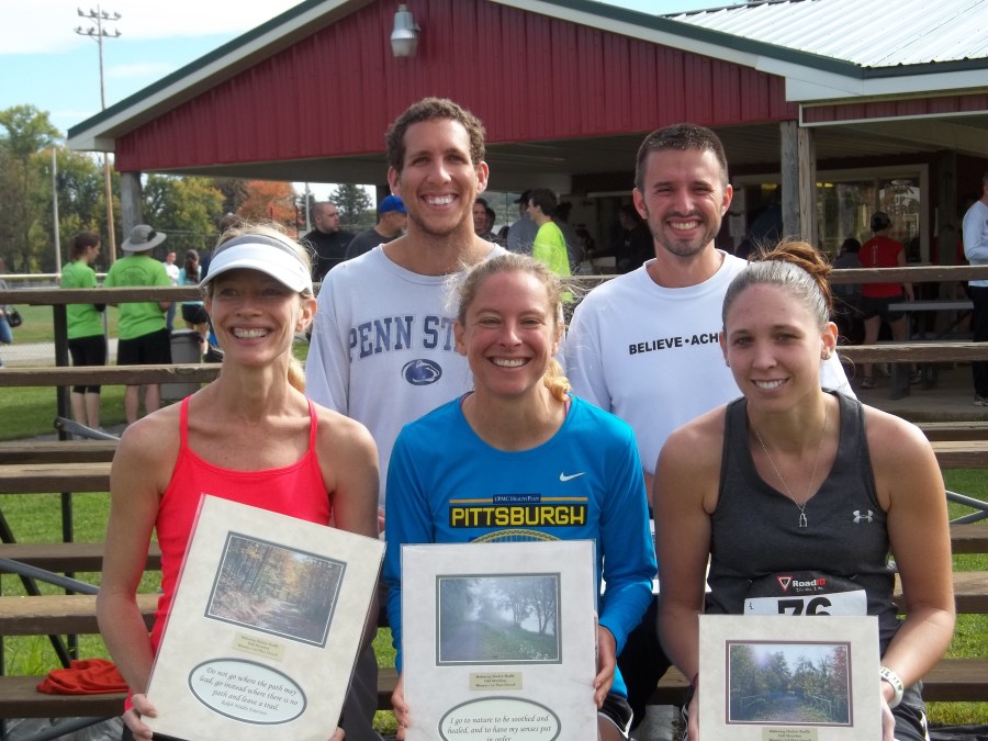From left to right – front: Rachel DeFreitas (2nd female finisher) Marilyn Gregory (1st female finisher; 1:32:27.2) Nikki Boyles (3rd female finisher) Back: Justin Schulte (2nd male finisher) Curtis Houser (1st male finisher; 1:23:15.3) Missing from photo: Richard Albertson (3rd male)